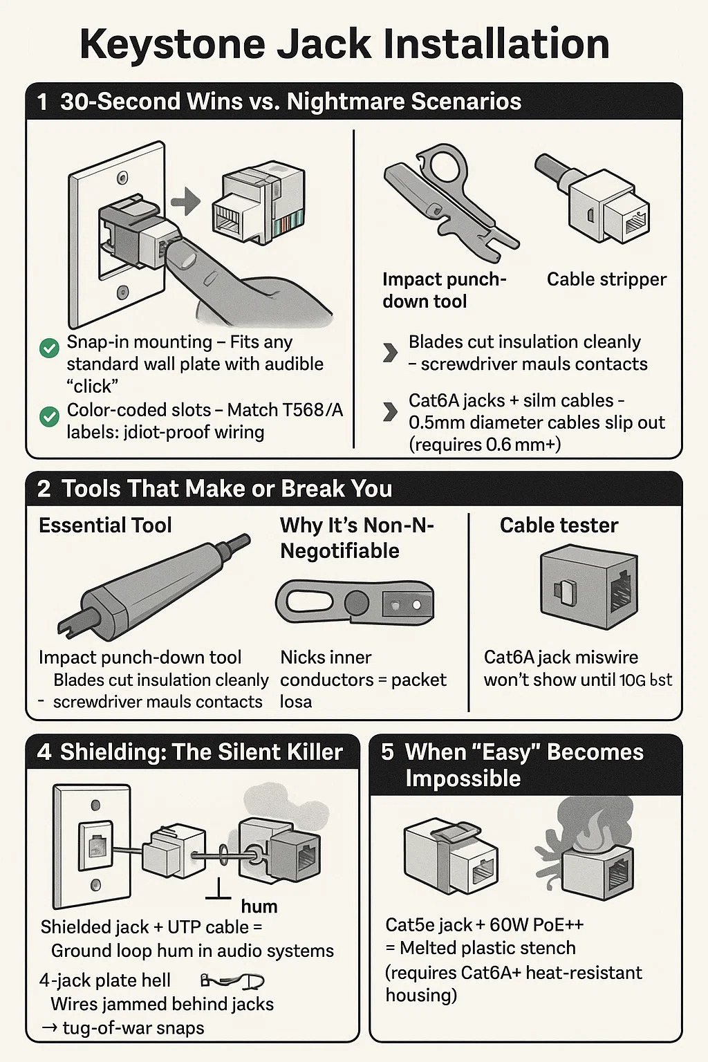 PoE peklo: Cat5e jack 60W PoE = roztavený plastový zápach (vyžaduje Cat6A tepelne odolný kryt).