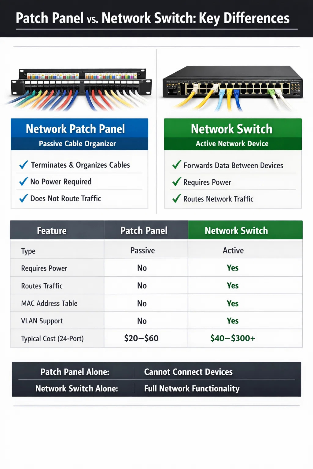 A sieťový patch panel je organizačný nástroj pre štruktúrovanú kabeláž. Je úplne pasívny, nevyžaduje žiadne napájanie a sám o sebe poskytuje nulovú sieťovú funkčnosť. Sieťový prepínač je aktívnym mozgom vašej káblovej siete – bez neho nič nekomunikuje. Potrebujete prepínač bez ohľadu na to, či používate patch panel.