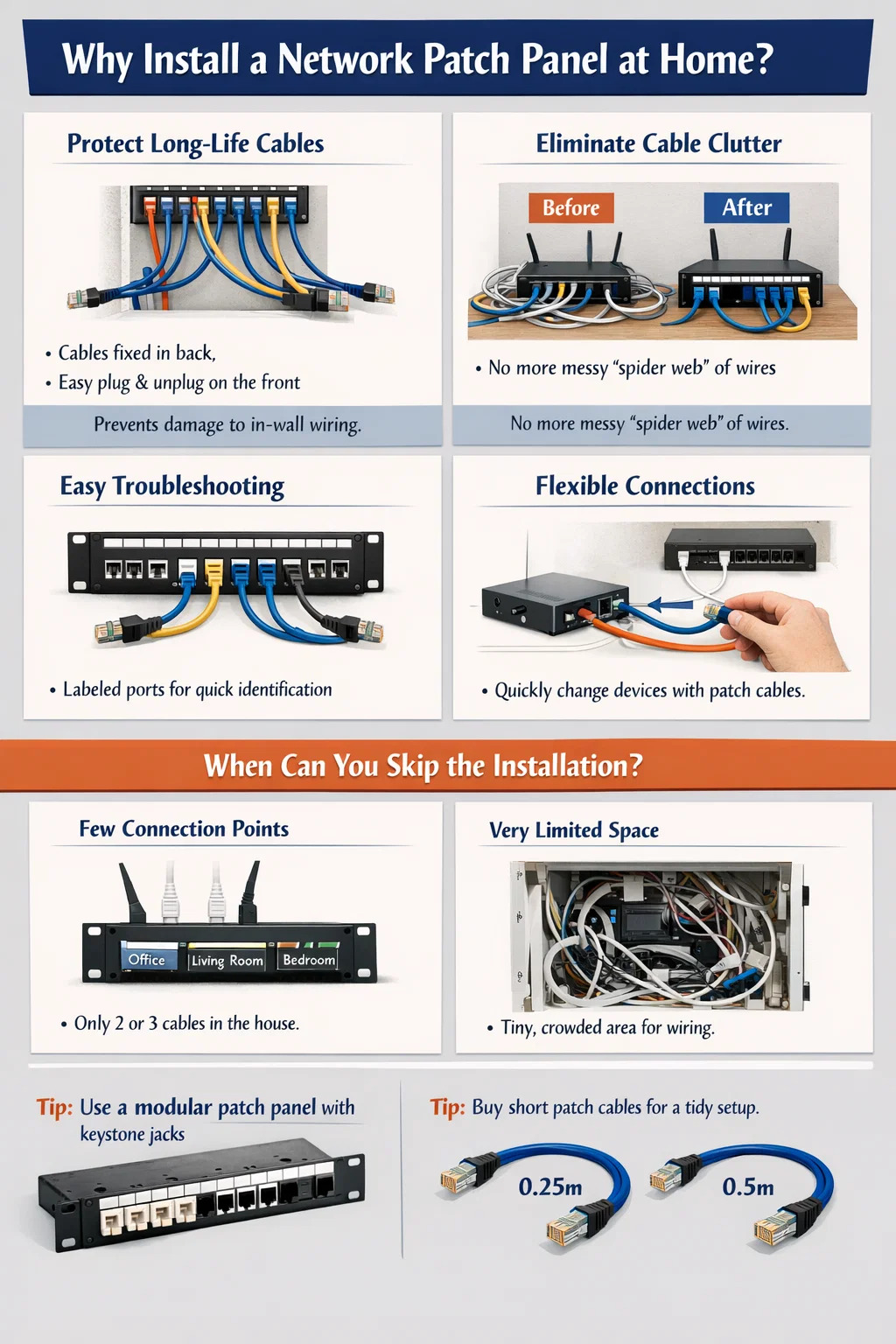 Ak máte káble vedené do každej miestnosti vo vašom dome, v nízkonapäťovej skrinke môže byť 5 až 10 sieťových káblov. Ich zapojenie priamo do smerovača má za následok špinavú spleť káblov, čo znemožňuje zavrieť dvierka skrinky. S patch panelom sú všetky káble prehľadne usporiadané v rade, každý port je očíslovaný, čo je vizuálne príjemné.