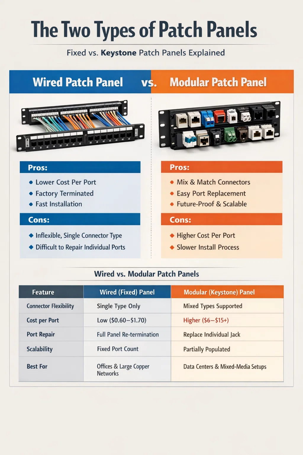 Káblový patch panel sa dodáva s káblami, ktoré sú už z výroby ukončené v zadnej časti panelu. Na druhej strane modulárny patch panel sa dodáva ako prázdny rám, ktorý akceptuje vymeniteľné keystone konektory, čo umožňuje inštalačnému technikovi vybrať si typy konektorov, kategórie a dokonca kombinovať typy médií v rámci jedného panelu. Obidve slúžia tej istej základnej funkcii – organizovanie a smerovanie sieťových pripojení – ale robia to zásadne odlišnými spôsobmi a vyhovujú rôznym scenárom nasadenia.