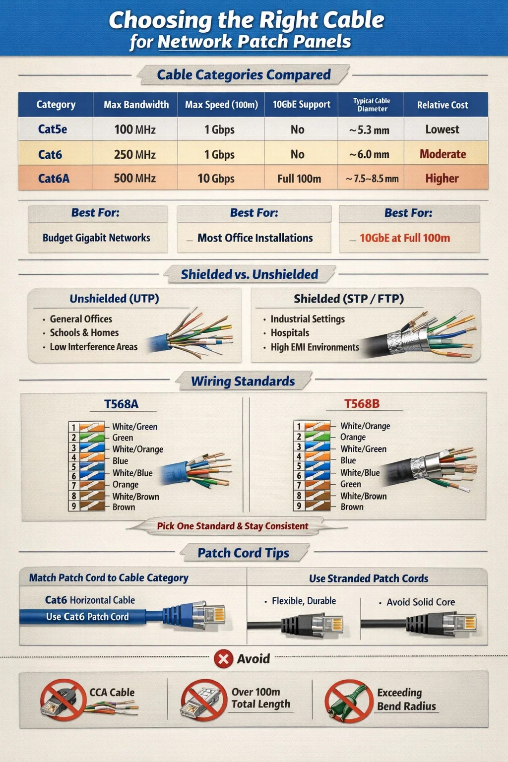 Pretože prepojovací panel obsahuje ďalšie pripojovacie body – dierované koncovky na zadnej strane a porty RJ45 na prednej strane – je nevyhnutné použiť kategóriu kábla, ktorá zodpovedá alebo presahuje kategóriu hodnotenia vášho panela. Napríklad zmiešanie patch panela Cat6A s horizontálnymi chodmi Cat5e okamžite obmedzí výkon vášho systému na Cat5e bez ohľadu na to, na čo je samotný panel určený.