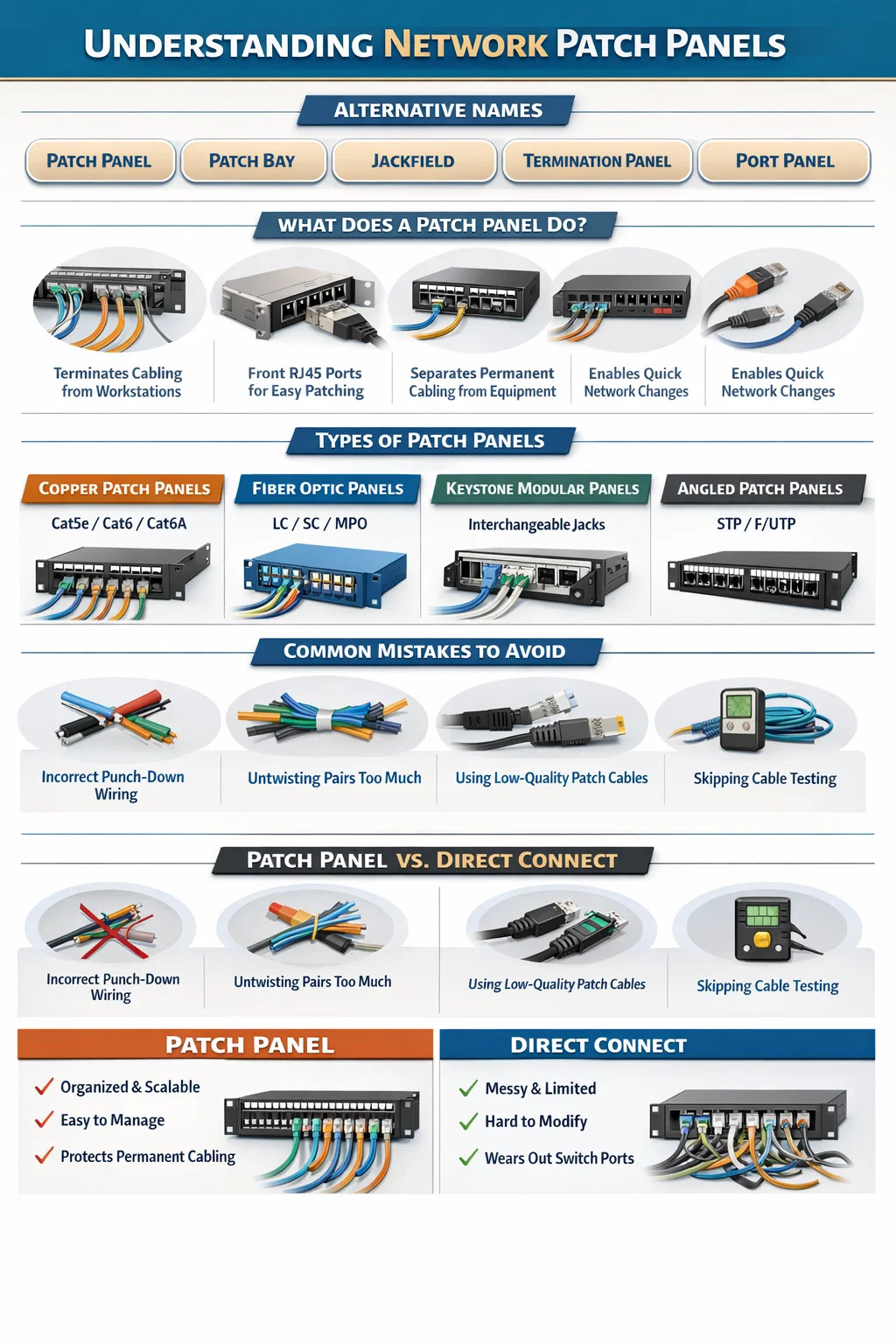 In broadcast and AV integration projects, both types may exist in the same rack, handling different signal types. IT staff typically manage network patch panels while audio engineers manage patch bays, even within the same physical facility.