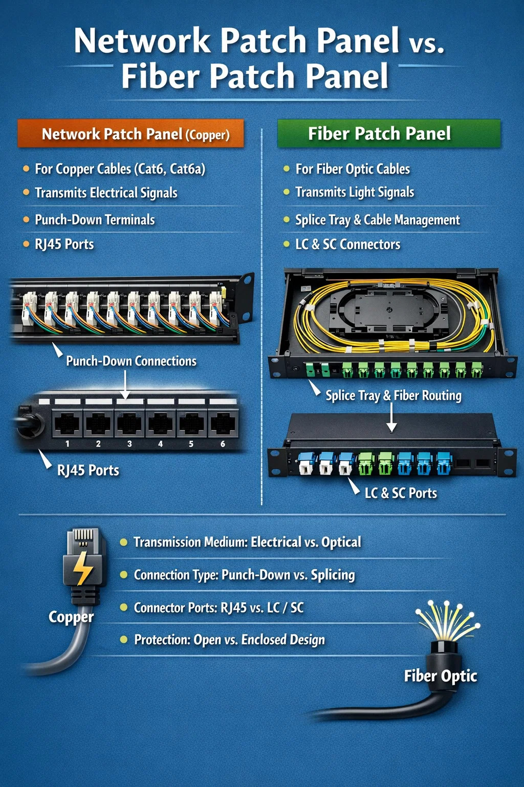 Panel opráv siete: Je určený pre medené káble (t.j. bežne používané sieťové káble Cat6 alebo Cat6a). Vnútorne spája medené vodiče a prenáša údaje prostredníctvom elektrických impulzov.